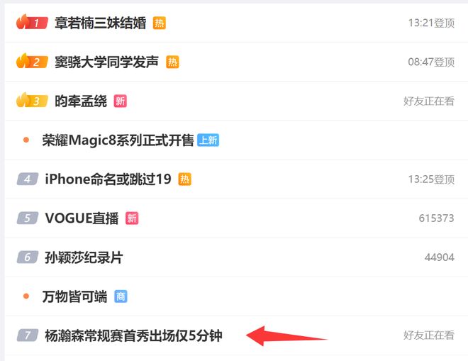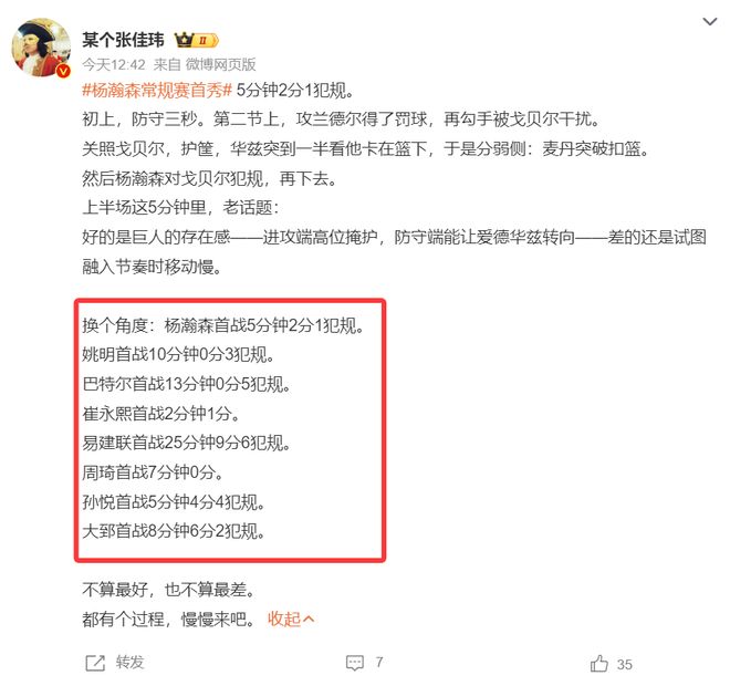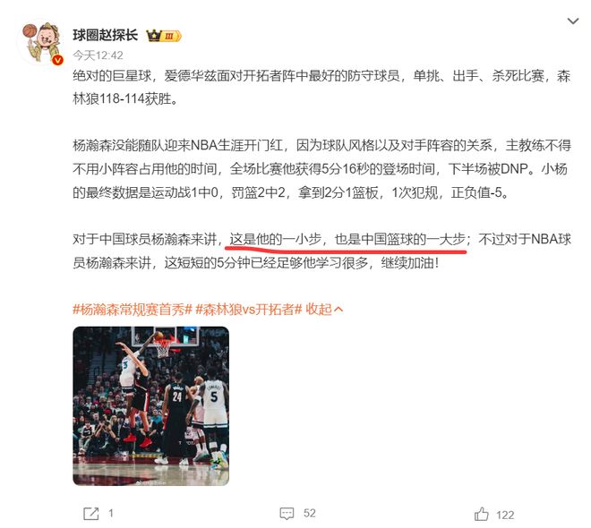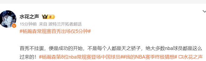 赛后杨瀚森常规赛首秀出场仅5分钟还是登上了国内热搜榜,因为国内的媒体人还是在热议小杨的表现。
