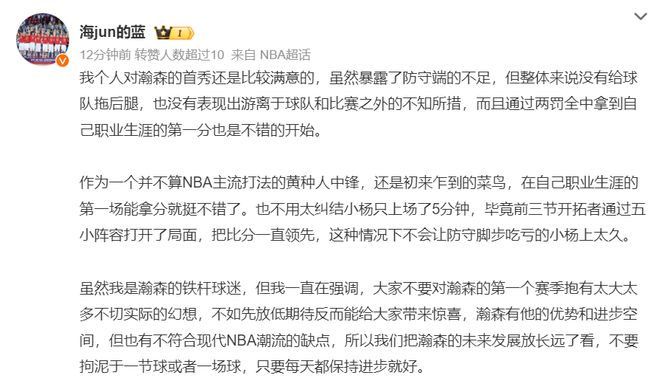 海Jun的蓝:我个人对小杨首秀比较满意,虽然暴露了防守端的不足,但整体并没有给球队拖后腿,也没有游离在体系之外,而且通过两罚拿到生涯第一分是不错的开始。