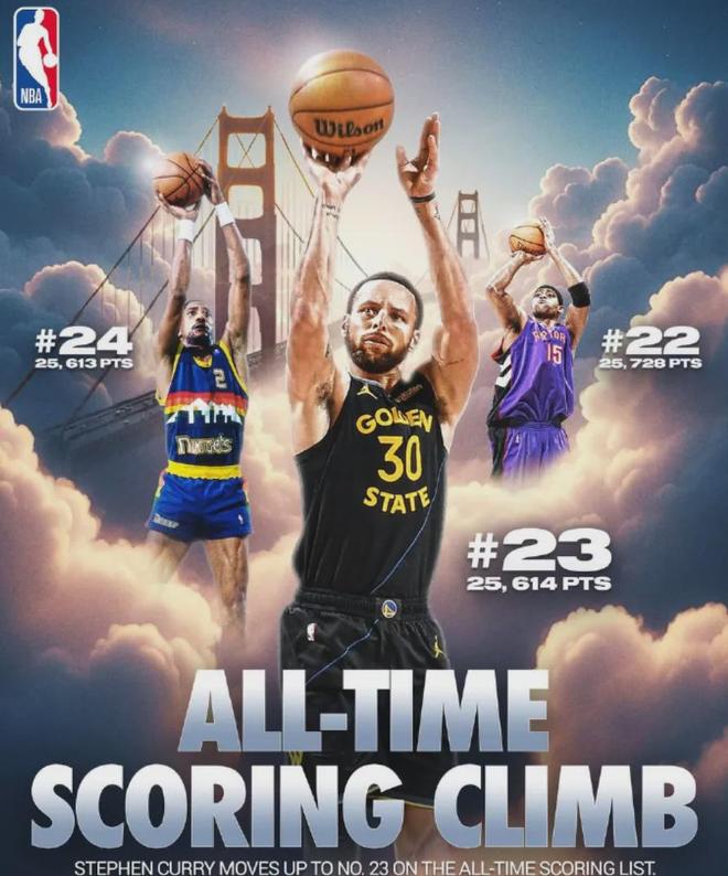库里还正式超越了掘金的传奇球星亚历克斯·英格利什,升至NBA历史得分榜第23位。