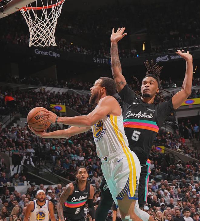 本场比赛的库里保持强势,他在第二节比赛开始频频得分,尽管不是在三分线外找到投射感觉,但频繁的突破上篮还是让他获得不少分数,还能给马刺造成内线杀伤。