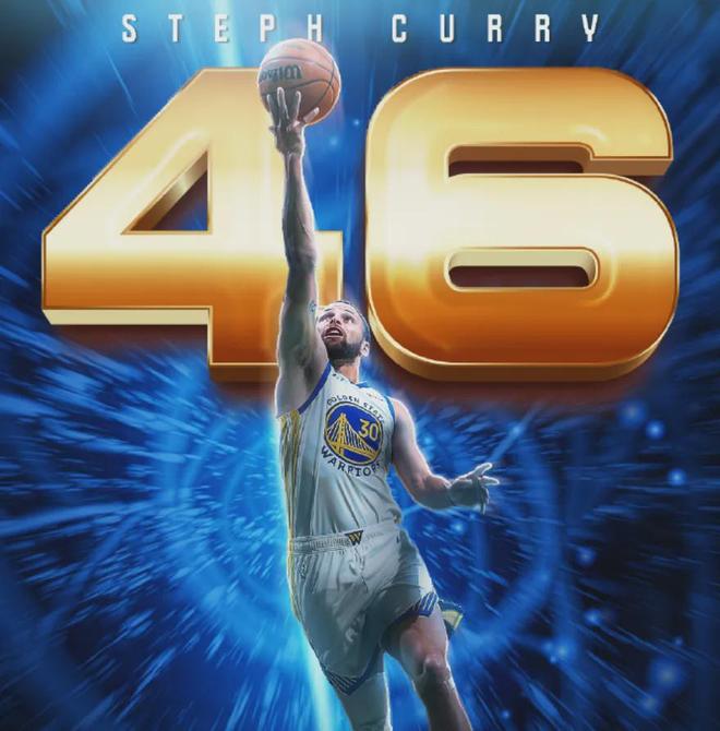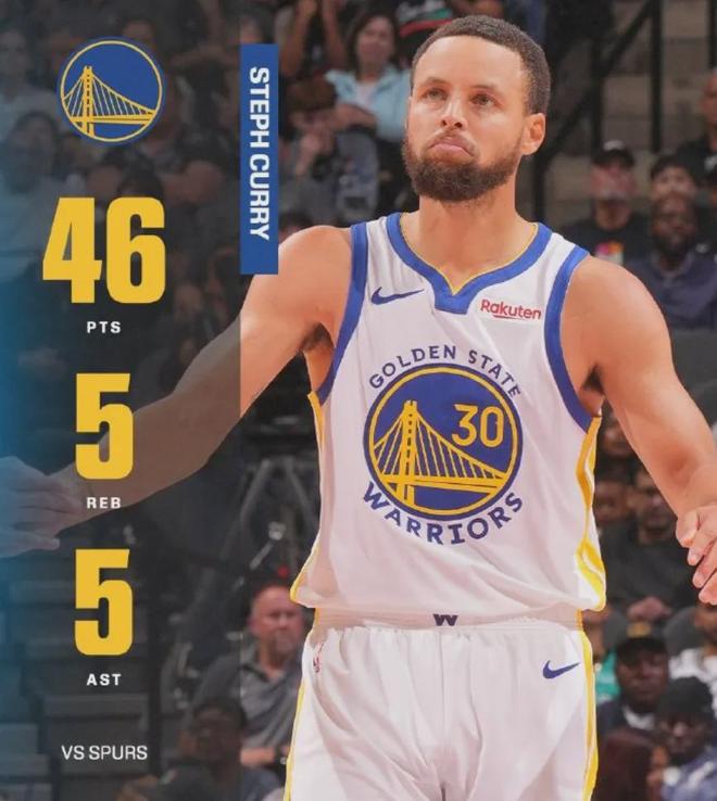 库里首发出战不到34分钟,25投13中拿下46分5篮板5助攻2抢断,在三分线外16投5中,只出现了1次失误。